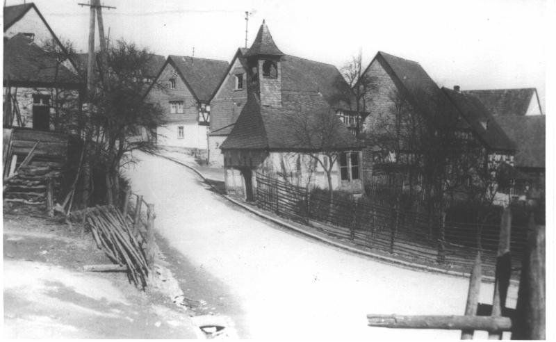 Das Gackenbacher Unterdorf mit dem alten Backhaus (rechts), Postjes Haus - der früheren Poststelle (links)